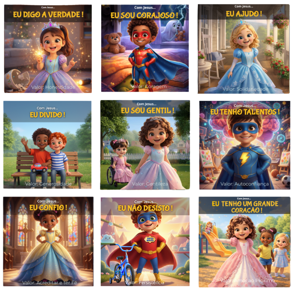 A coleção “Com Jesus…” ensina valores como coragem, verdade, gentileza, confiança, entre outros... de um jeito que a criança entende e sente.